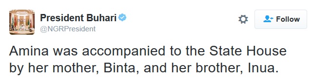 Amina finally arrived at the presidential villa, Abuja in the company of Presidential Special Adviser on Social Investment, Maryam Uwais and Borno State Governor, Kashim Shettima and a representative from Bring Back our Girls group, Hadiza Bala Usman.