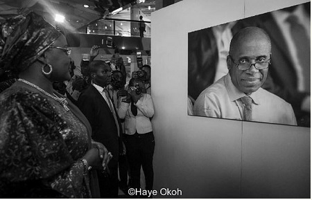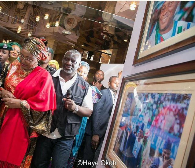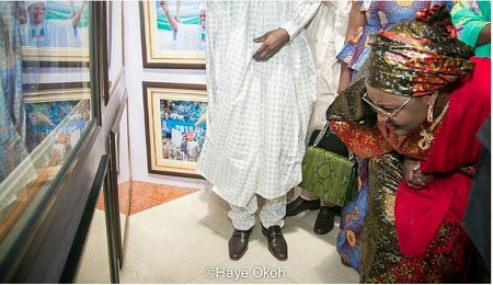 .Aisha Buhari was pictured looking closely with delight at the pictures of her husband and his colleagues of the All Progressives Congress during the 2015 election campaign.