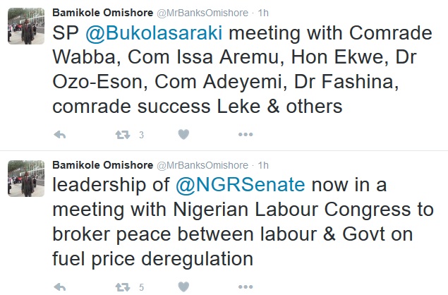 "Senate President, Bukola Saraki, is meeting with both factions of NLC. Comrade Wabba, Issa Aremu, Honourable Ekwe, Dr. Ozo-Eson, Comrade Adeyemi, Dr Fashina and others," Omisore tweeted.