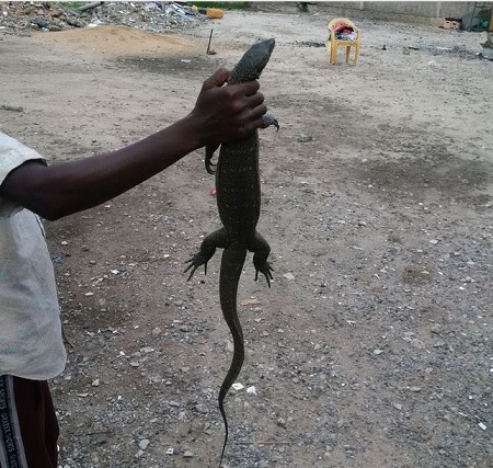 "This monitor Lizard was killed around my Estate in Lekki this afternoon and funny enough, these guys didn't waste time to kill it. Well in this time of austerity, anything goes and besides, this is bush meat, I heard they are much more nutritious than the meat we eat"
