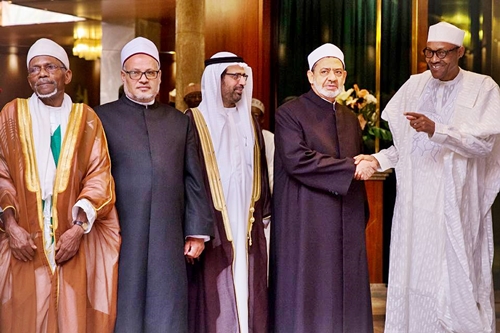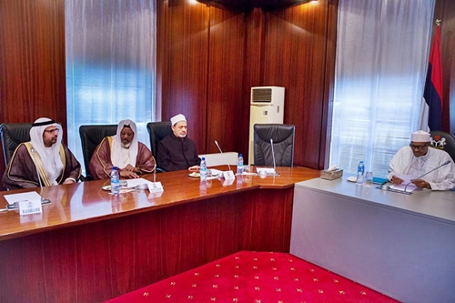 President Buhari with R-L: Shaykh Dr Ibrahim Saleh Alhussainy, H.E. Dr Ahmed El-Tayeb, Dr Ali Rashed Al-Naomi and Dr Ibrahim Hodhod as President Buhari receives in audience H.E. Dr Ahmed El-Tayeb, Grand Imam Sheikh Al-Azhar from the Arab Republic of Egypt in Statehouse on 18th May,2016.