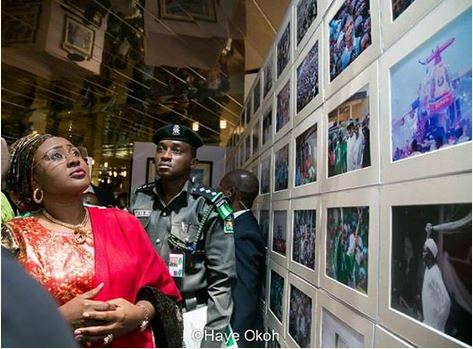 .Aisha Buhari was pictured looking closely with delight at the pictures of her husband and his colleagues of the All Progressives Congress during the 2015 election campaign.